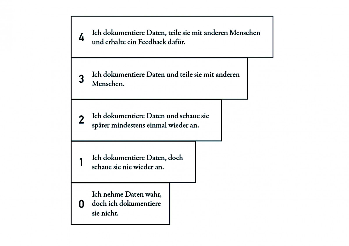 Anhand der Recherchen aus meinem Diplomprozess und den Erkenntnissen aus der praktischen Anwendung entwickelte ich ein Stufenmodell zum Grad der Vernetzung von Daten. Die Stufen definieren sich durch wichtige Merkmale im menschlichen Umgang mit Informationen. Das Stufenmodel stellt eine Orientierungshilfe für Dokumentationen dar. Will ich im Umgang mit meinen Daten innovativ sein, kann ich anhand der Stufen meine Dokumentation optimieren. Aber mein Arbeitsprozess wird immer auch durch äussere Einflüsse beeinflusst. Ich verstehe Prozesse als mehrdimensionale Netzwerke und nicht als lineare Abläufe. Darum bleibt eine Prognose über die Innovation zum Zeitpunkt des Dokumentierens ungenau.