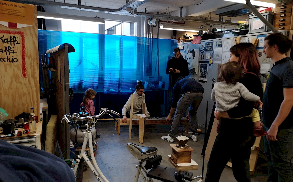 Ich mache hier im Distrikt 19 das Umgekehrte wie am OpenHouse. Dort haben wir Rest- und Abfallmaterial bereitgestellt, und die Besucher*innen möblierten für ein heisses Getränk unser Café, das Mach’s dir bequem. Entstanden sind eine Hand voll Möbel, die zwar eher unbequem sind, aber gut als einheitliche Kollektion funktionieren.